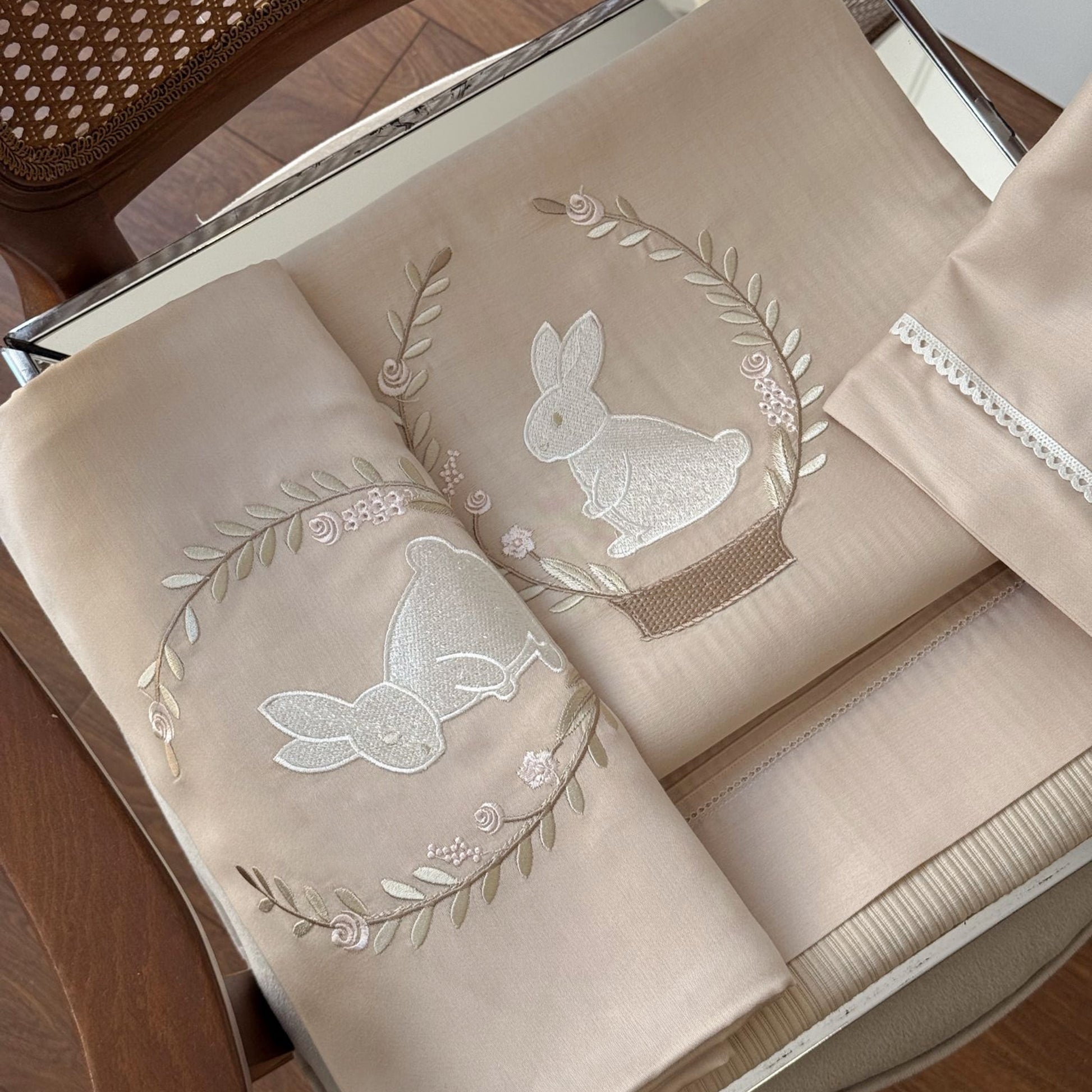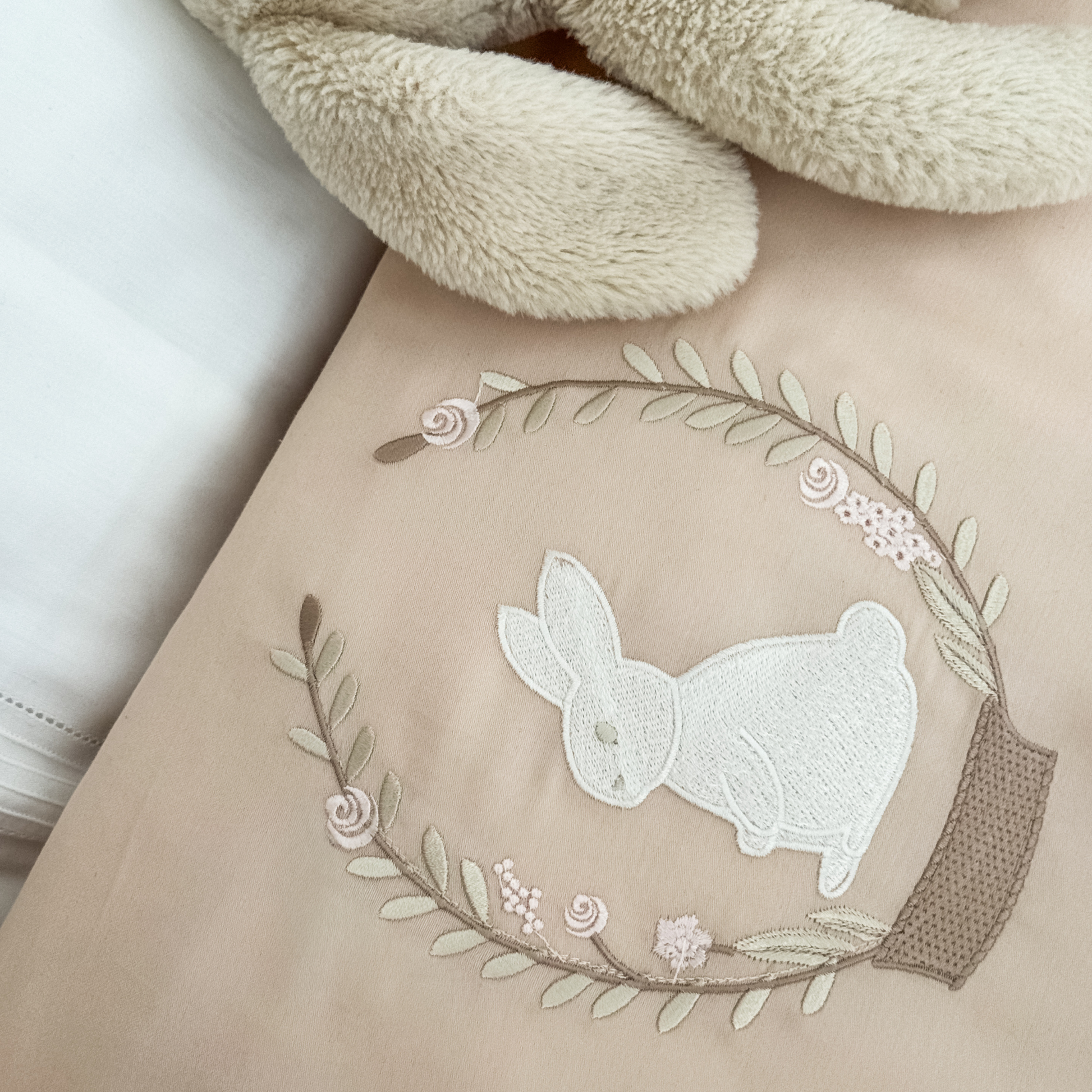 Sevimli ve modern bir tasarım isteyen aileler için Tavşan modeli, yumuşacık dokusu ve zarif makine nakışıyla bebek odalarına huzurlu bir hava katıyor.
